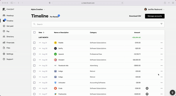 Now, keeping records of every little thing on Excel sheets is daunting. However, a bookkeeping solution such as Fincent can make it much easier. This application directly connects to your business bank account and fetches your transactions on the dashboard.