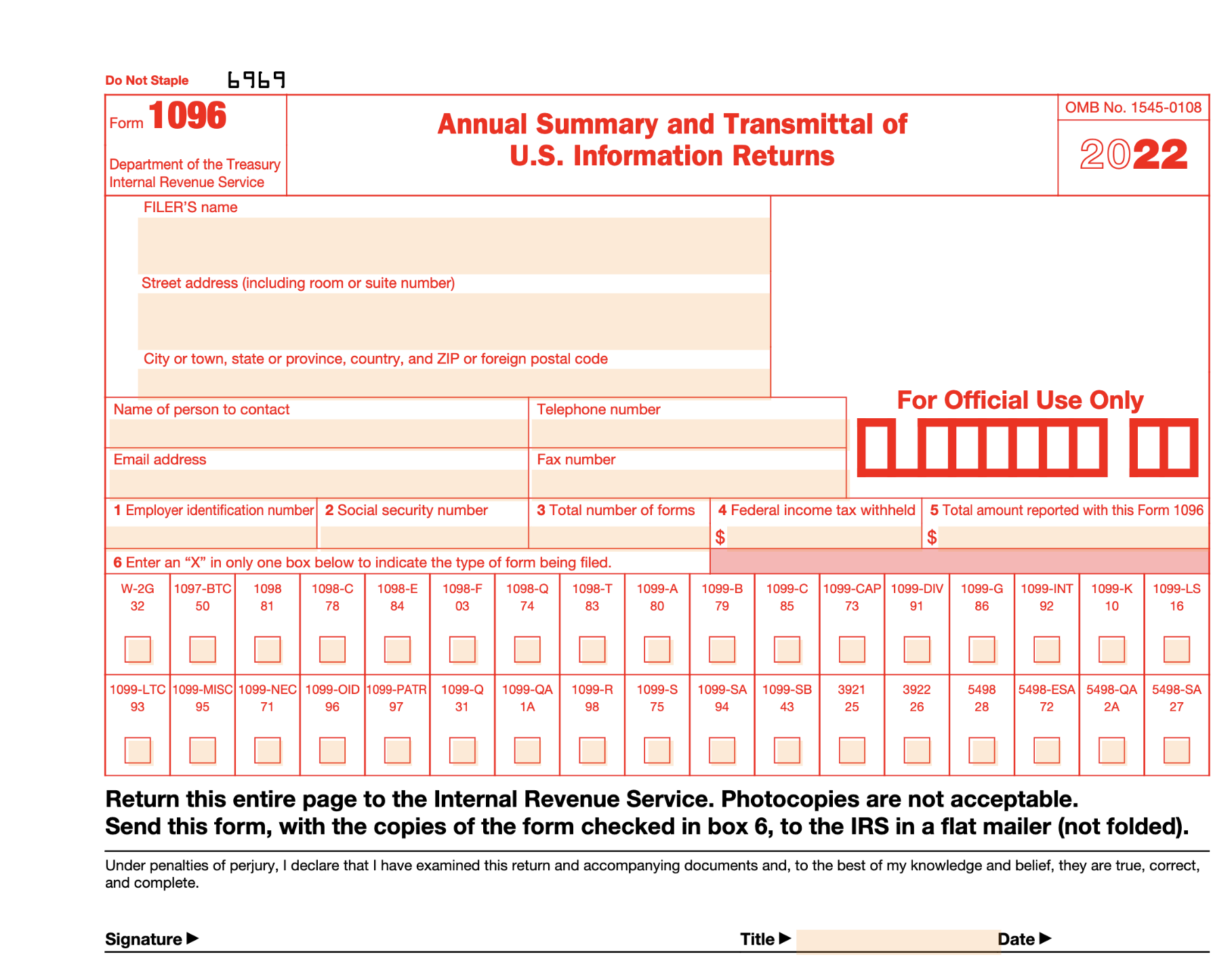 Form 1096 is an information return form that summarizes the information about any payment that you've made to any recipient for tax purposes. Form 1096 is also titled "Annual Summary and Transmittal of U.S. Information Returns".