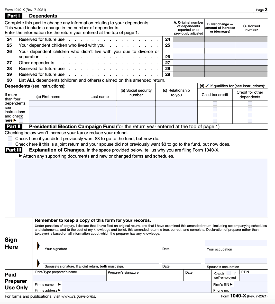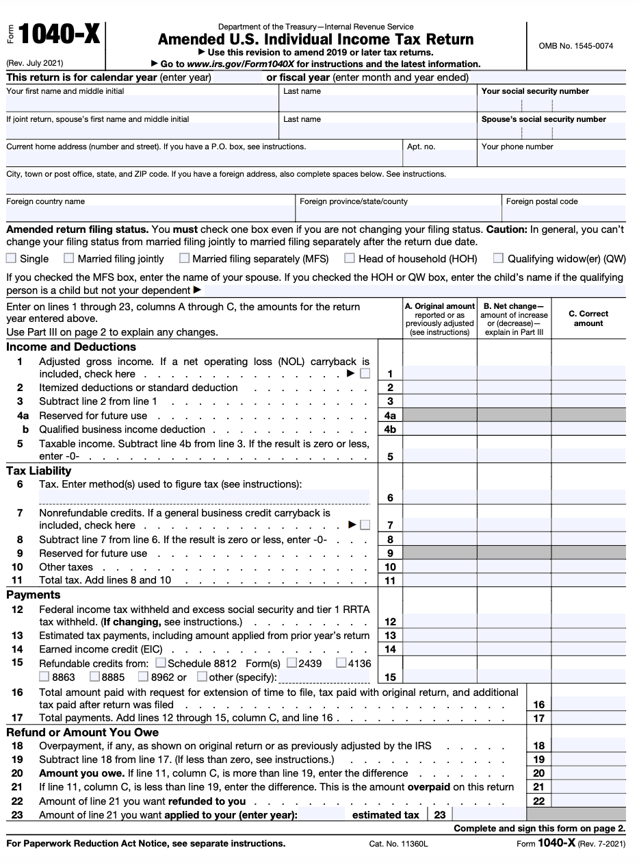 If you want to request a refund, you must submit Form 1040-X within a period of 3 years from the day you initially filed your original return or within 2 years from the day you made the tax payment, whichever comes later. However, some special rules apply when it comes to refund claims related to matters like net operating losses, foreign tax credits, and bad debts, among others.