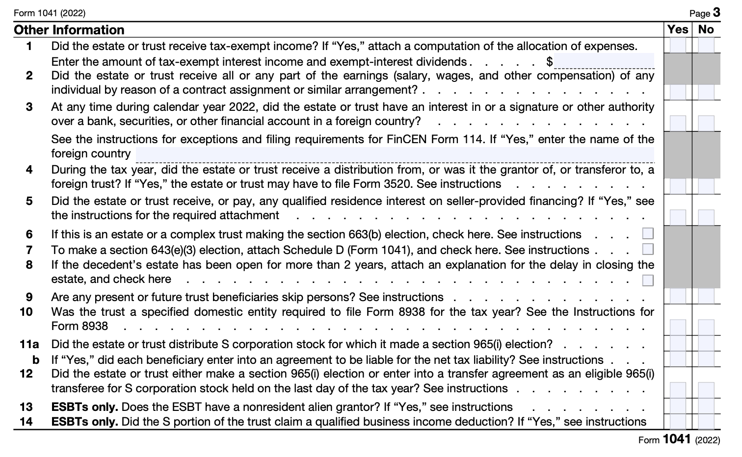 - Identification information: This section includes information about the estate or trust, such as its name, address, and tax identification number.