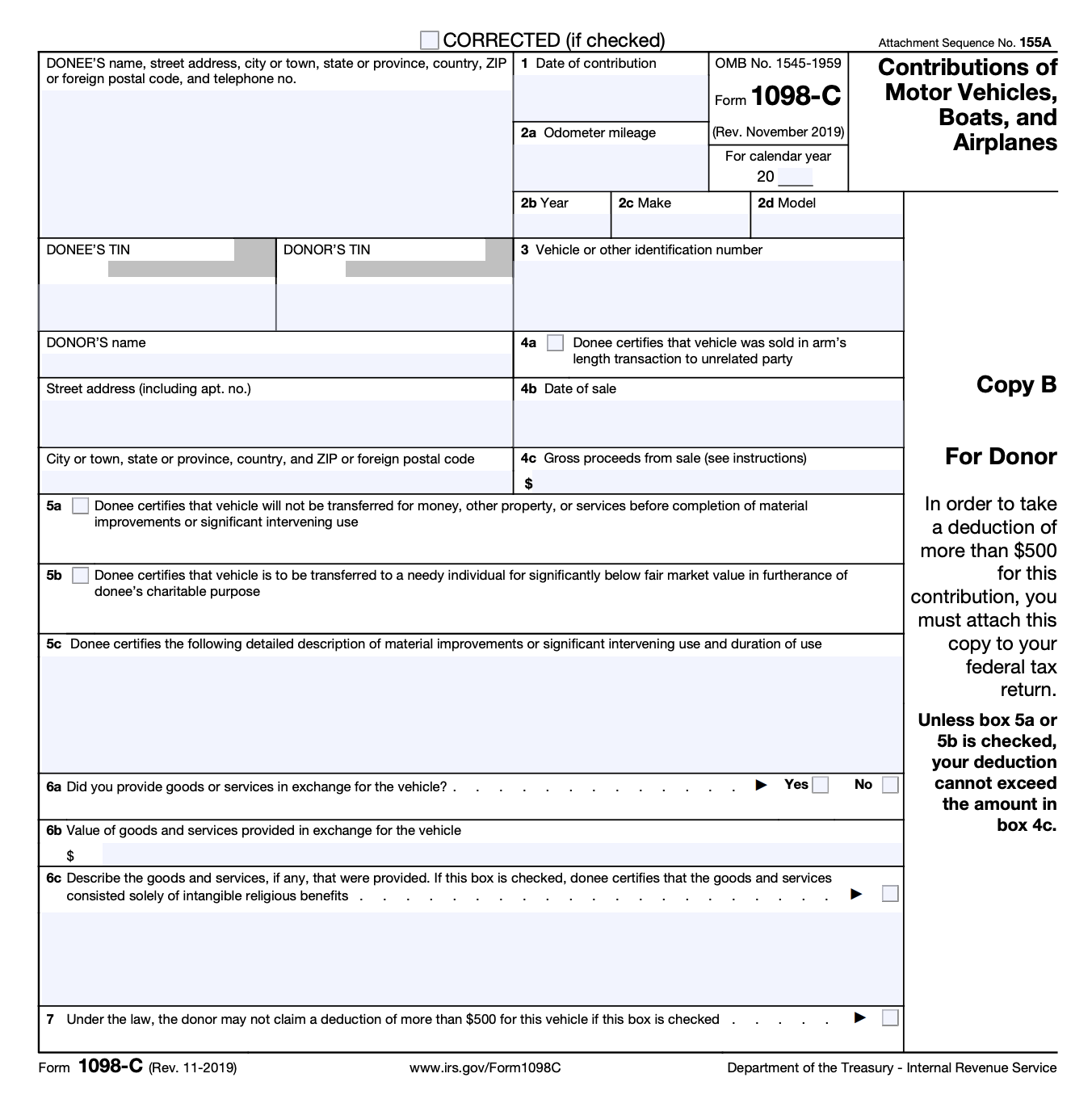 Copy B (For Donor): Of Form 1098-C is provided to the donor. It includes the same information as Copy A, along with the date of the donation, a description of the donated property, and the fair market value of the property at the time of the donation. The donor will use this information to calculate their tax deduction.