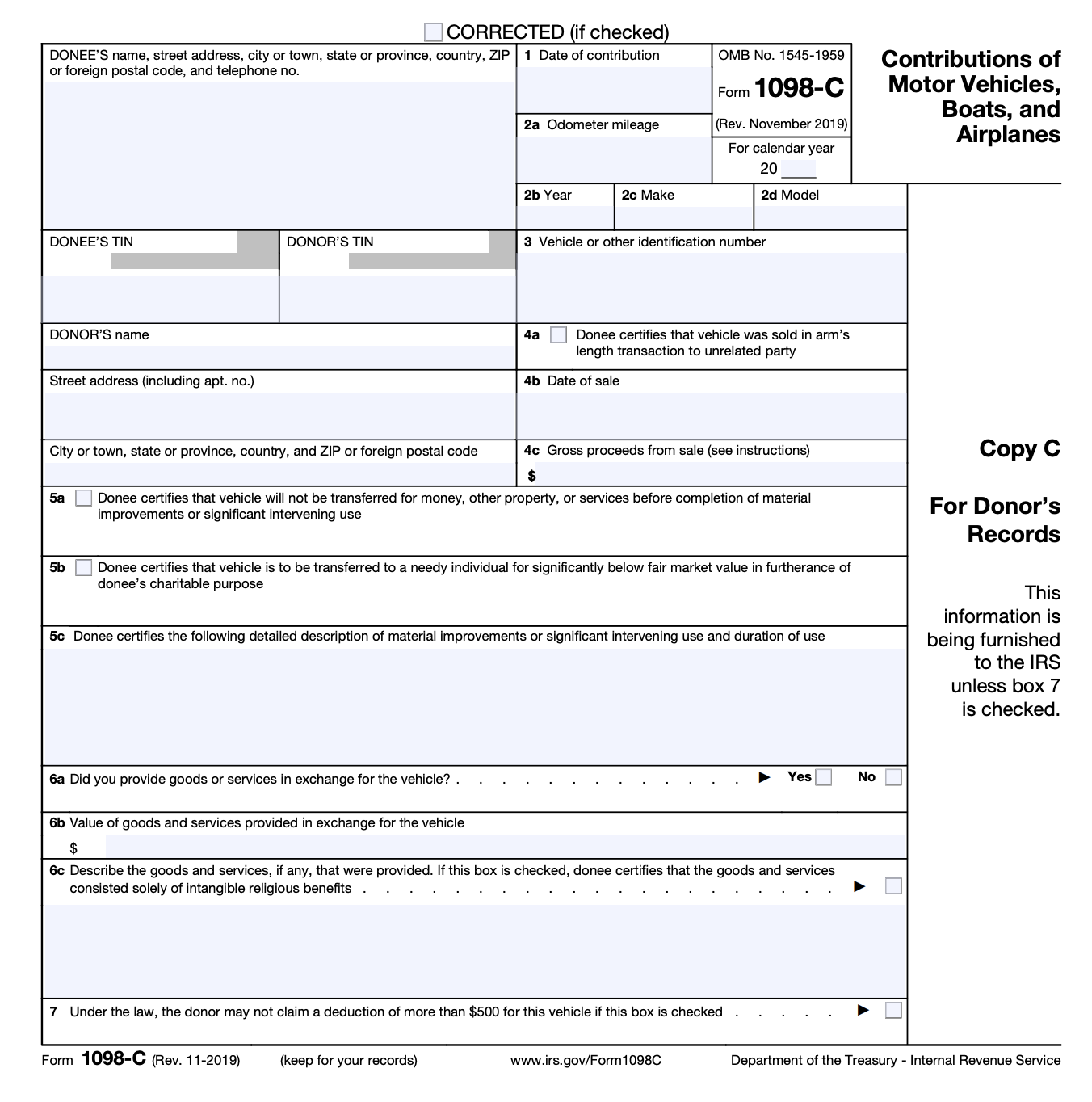 As a donor, you should keep a copy of Form 1098-C with your tax records for at least three years after the due date of your tax return or the date you filed your tax return, whichever is later.