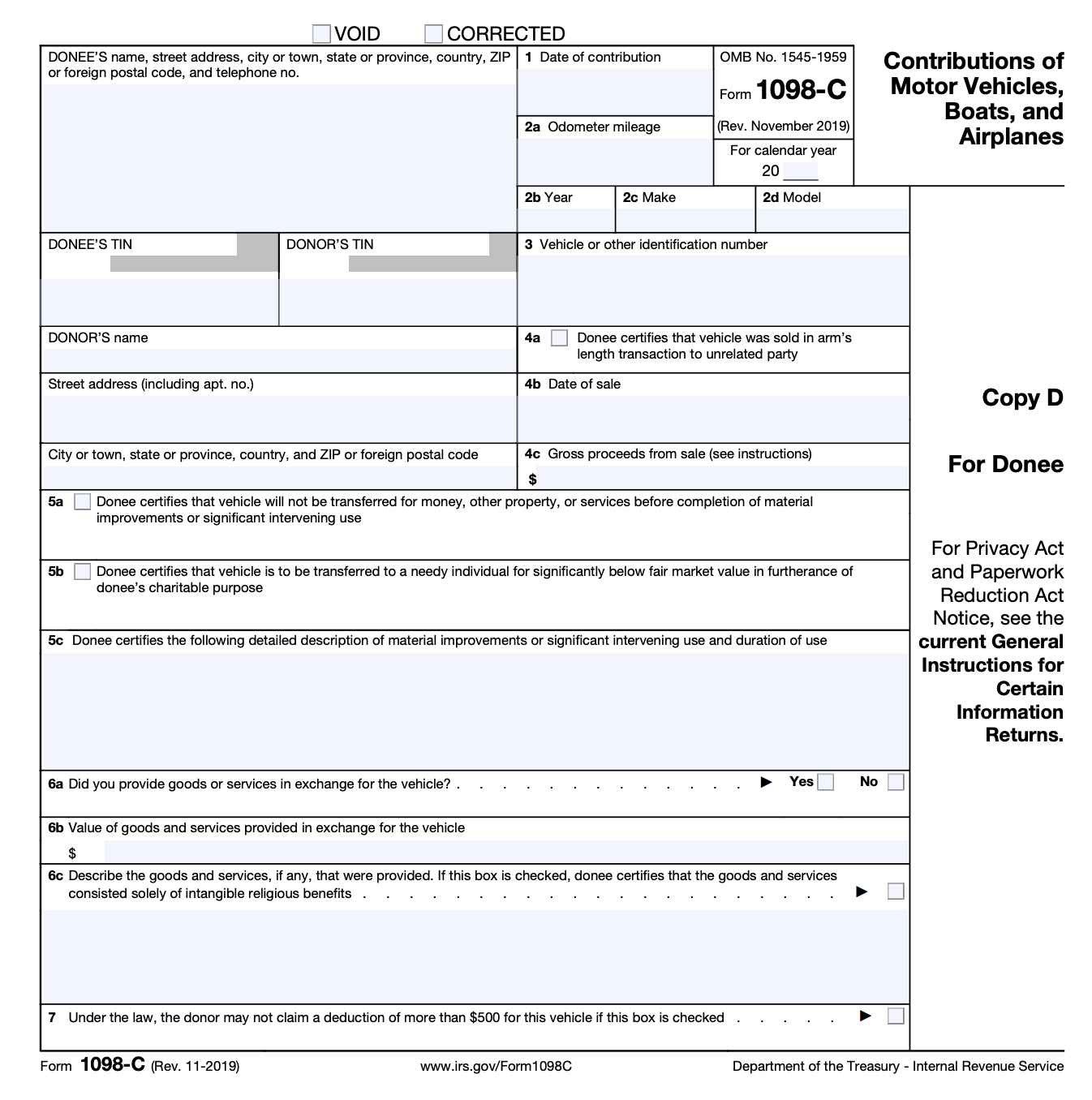 Copy D (For Donee): Of Form 1098-C is for the donor's records. It includes the same information as Copy B, and serves as a reminder of the donor's contribution and the fair market value of the donated property.