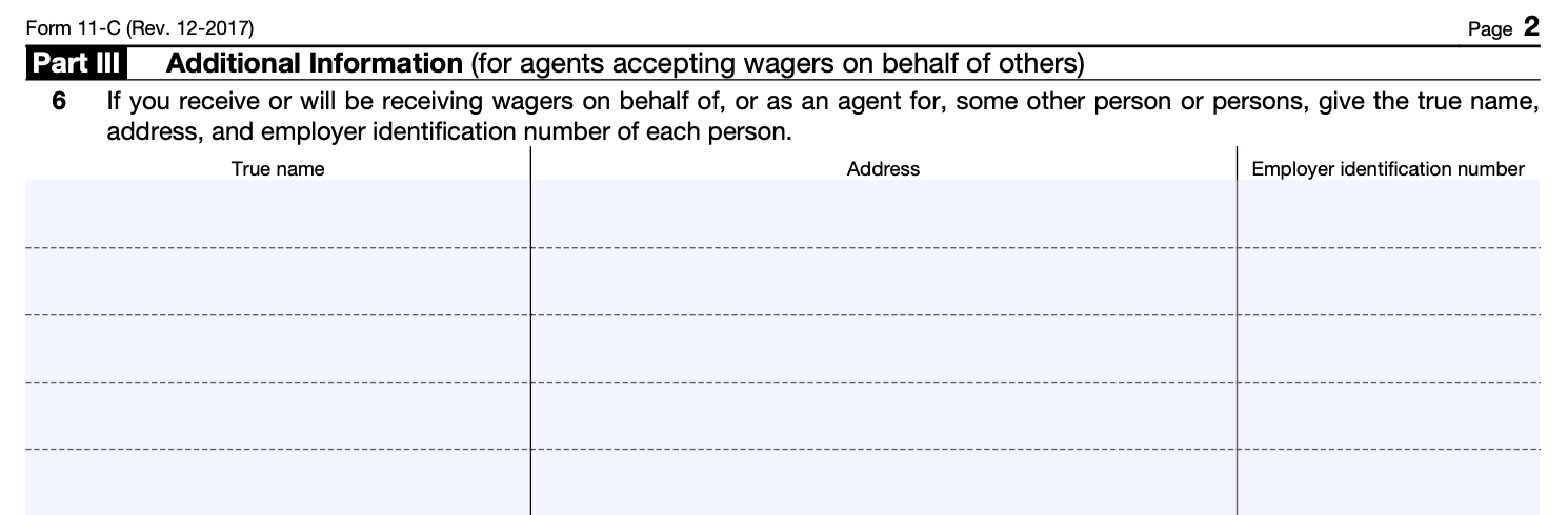 Registration requirement: Any person or entity involved in a wagering business must register by filing Form 11-C. This includes both businesses operating legally under state law and those engaged in illegal wagering activities.
