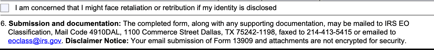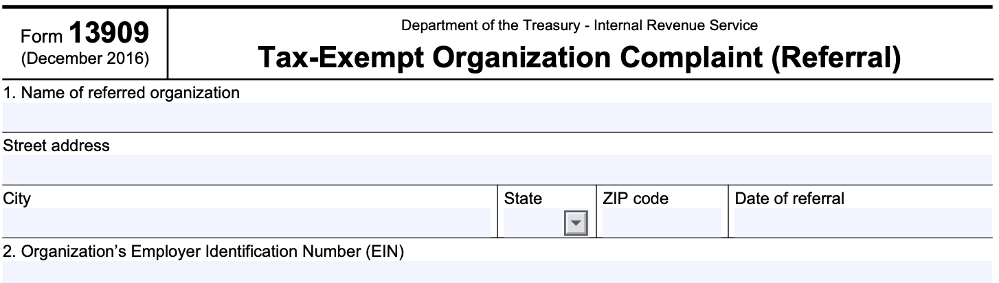 Form 13909: Tax-Exempt Organization Complaint (Referral)