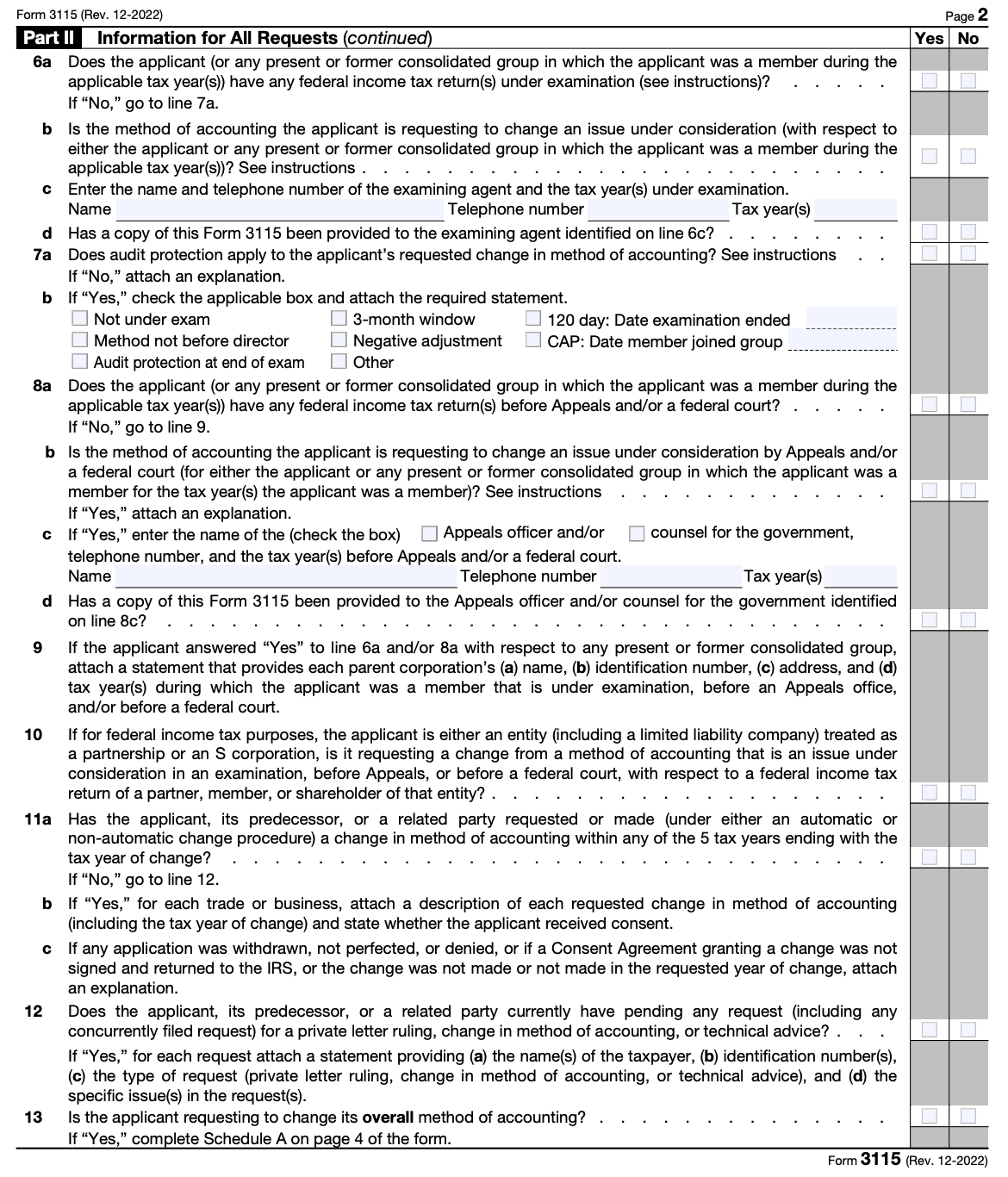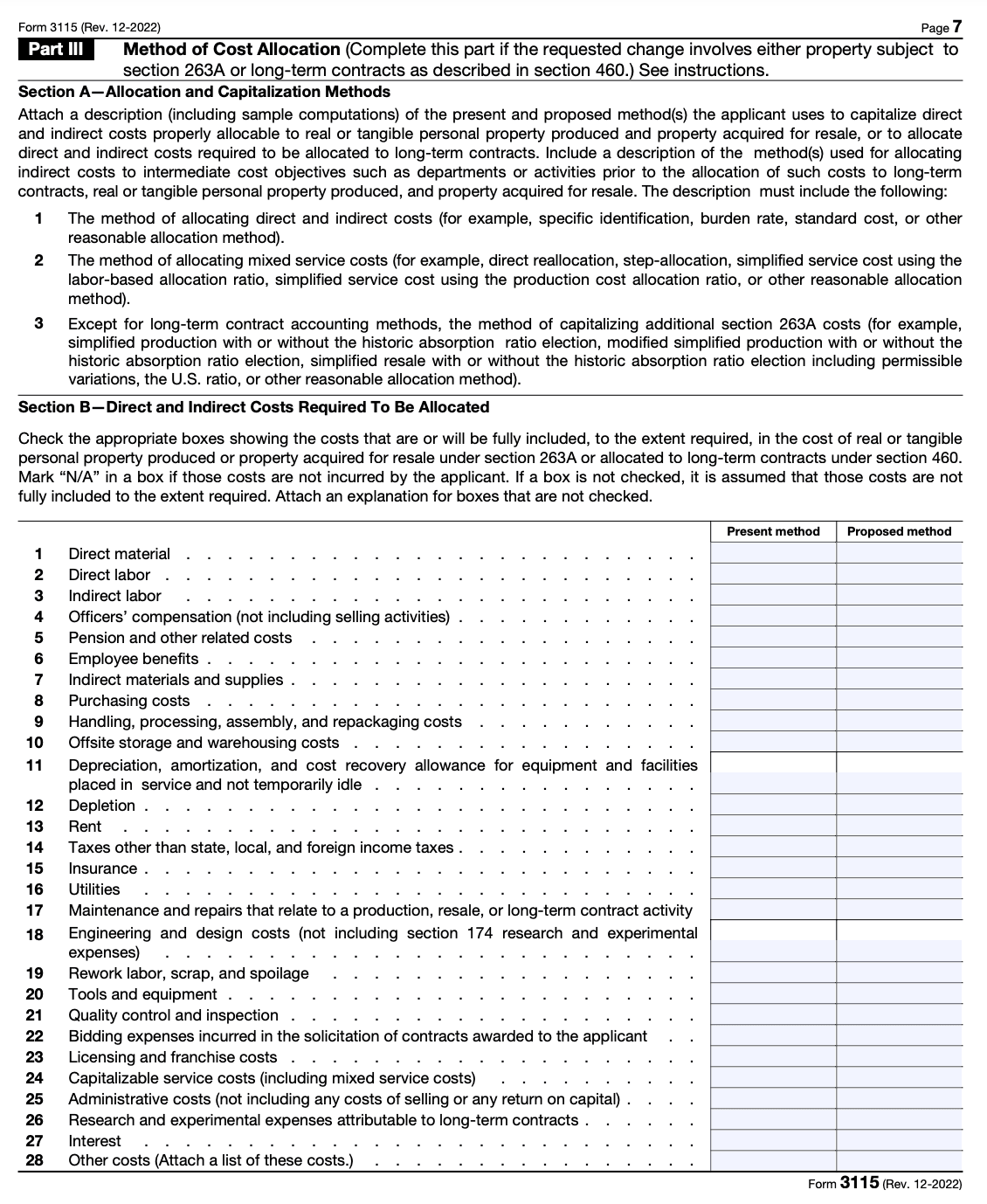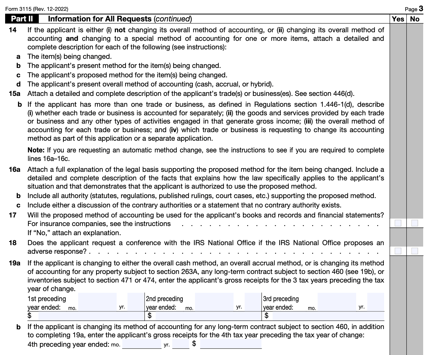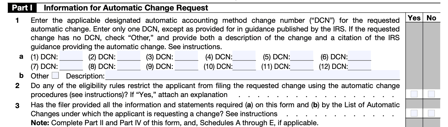 Consent requirements: In some cases, you may need to obtain the consent of the IRS to change your accounting method. The form includes a section where you can request this consent. Be aware that certain changes, such as changes from the cash to accrual method, generally require consent.