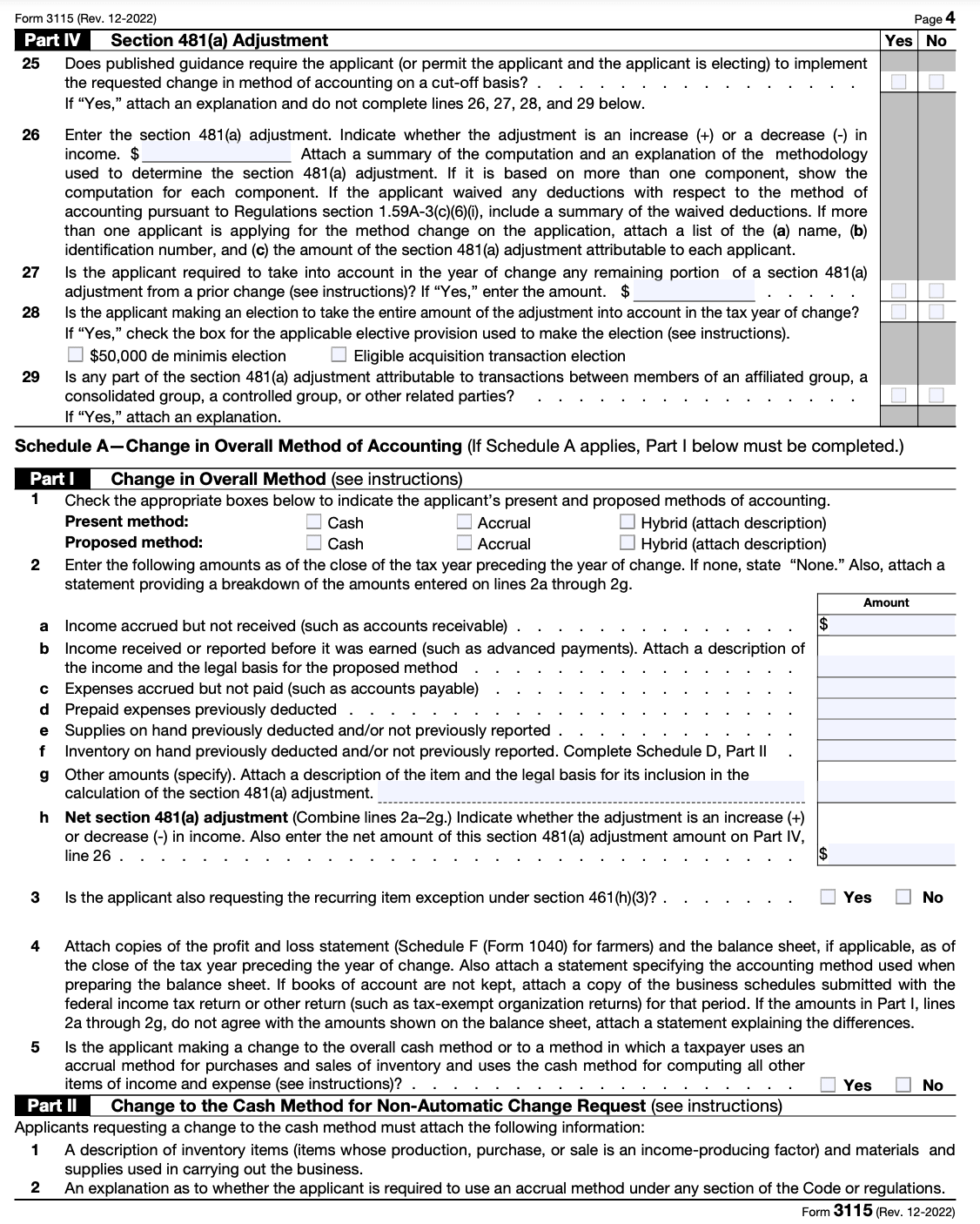 IRS Form 3115 helps businesses utilizing the cash method of accounting to document and report any changes in accounting practices to the IRS. This is particularly crucial when transitioning to or from the cash method, as it ensures that the change is properly documented and approved.
