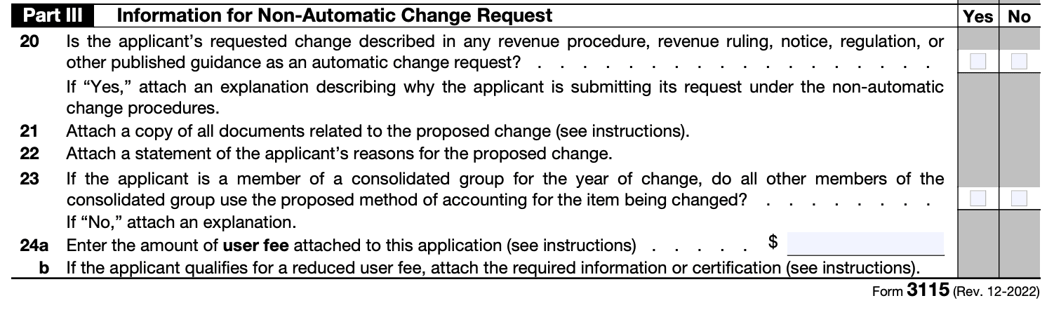User fee: As of my knowledge cutoff date in September 2021, filing Form 3115 requires payment of a user fee. The fee amount depends on the taxpayer's average annual gross receipts. Confirm the current user fee amount by referring to the instructions for Form 3115 or consulting the latest IRS guidance.