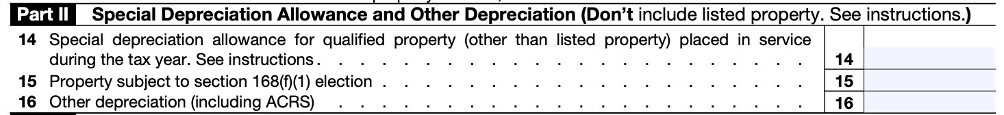 In this second part of Form 4562, you will list any type of special depreciation you're claiming, including bonus depreciation. This type of depreciation only applies to certain qualified property, and it's best to meet an expert to get your status right regarding special deduction. You can read the instructions for this section on the IRS site if you think you may qualify.
