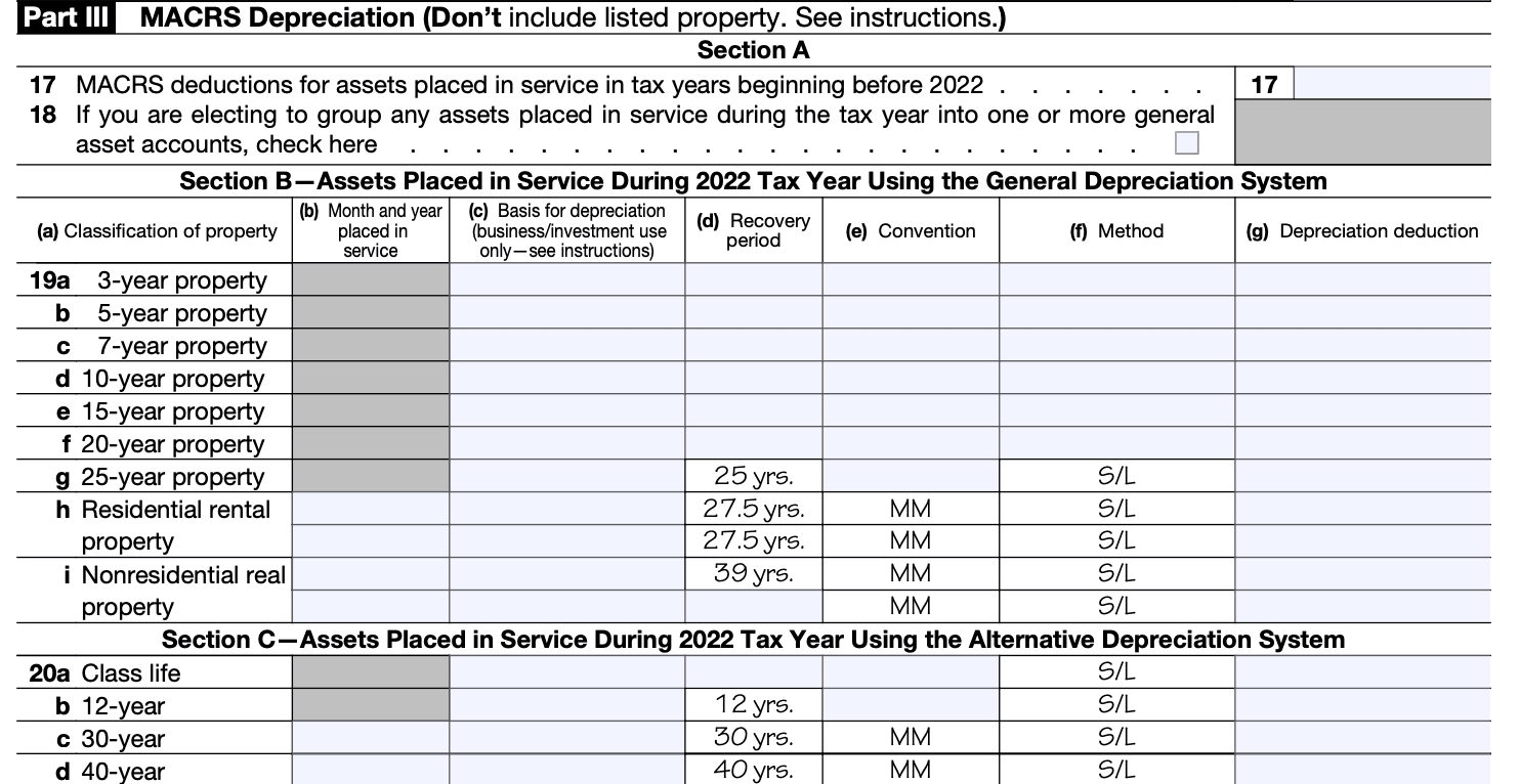 This is also the section where business and income-producing real estate are listed. The period for which you can depreciate property is determined by the Modified Accelerated Cost Recovery System (MACRS) guidance issued by IRS.