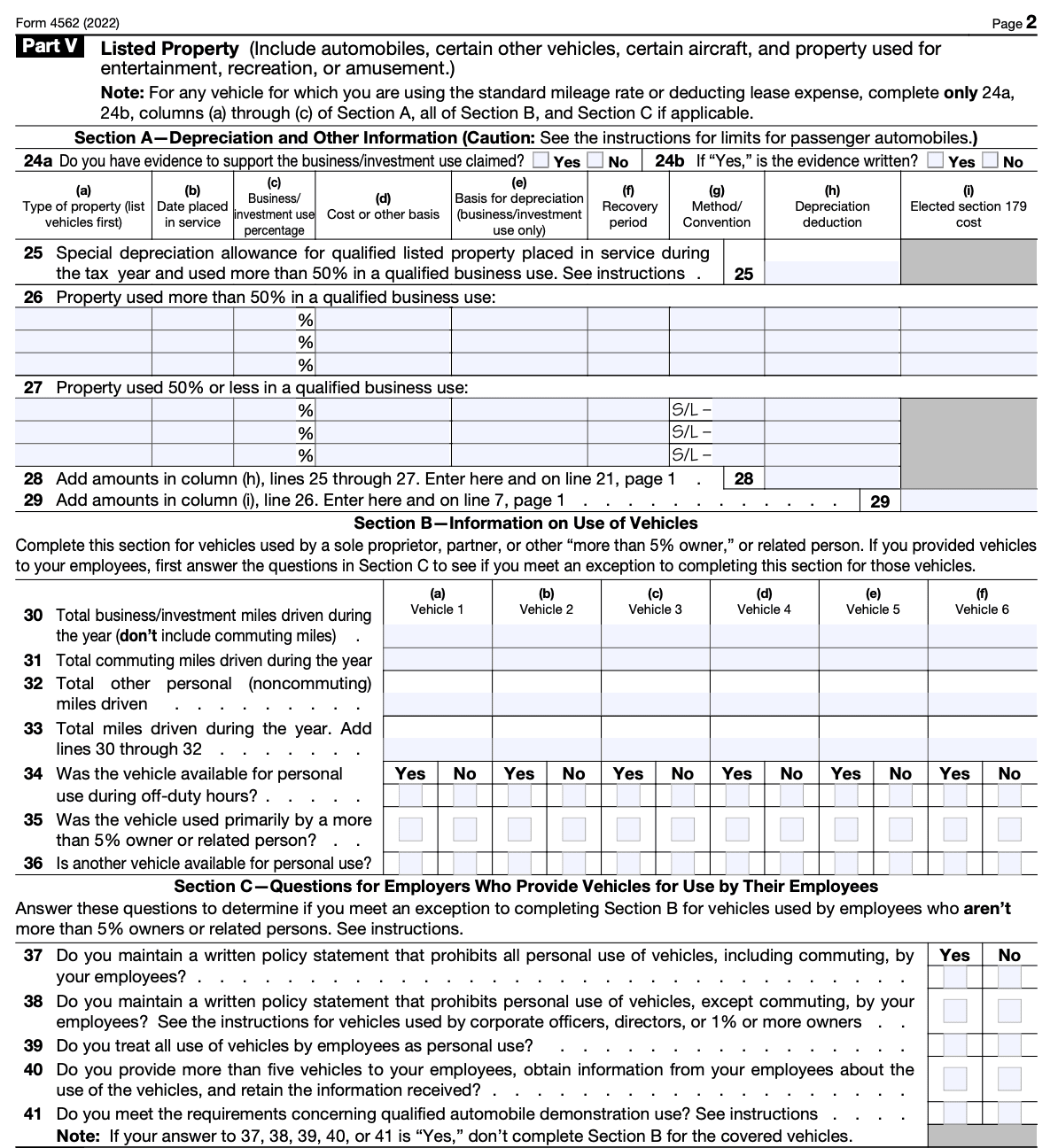 Part V of IRS Form 4562 is divided into three sections.
