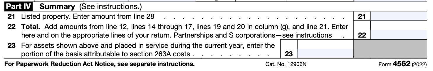 Part IV of Form 4562 is where you will add the total amount of depreciation from each part of the form. You will enter this amount on Line 13 of Schedule C for Form 1040.