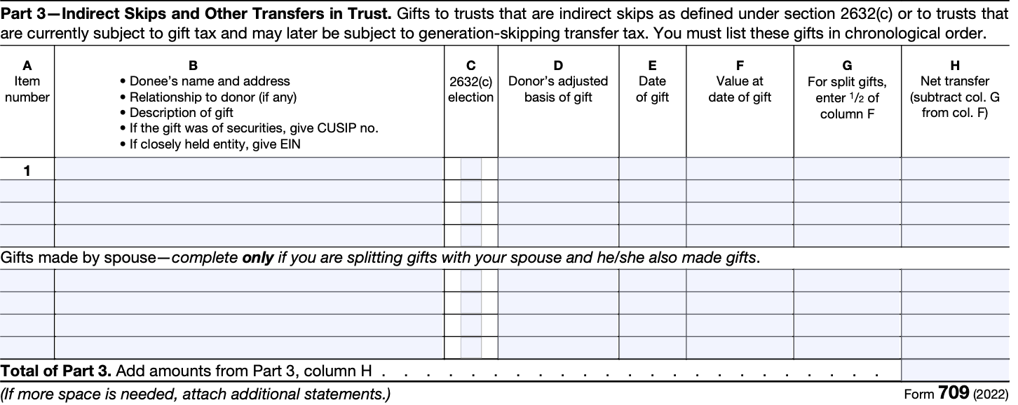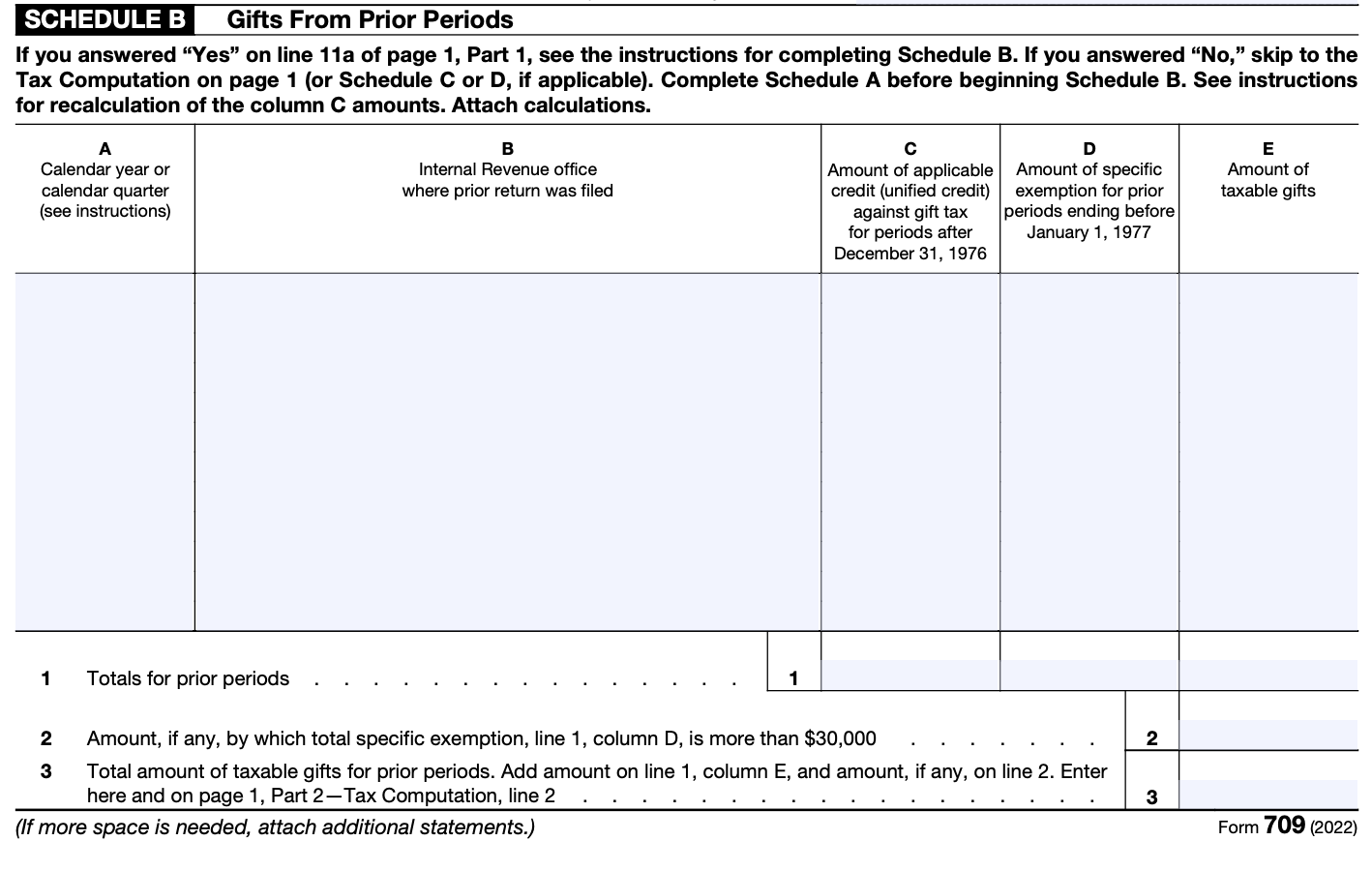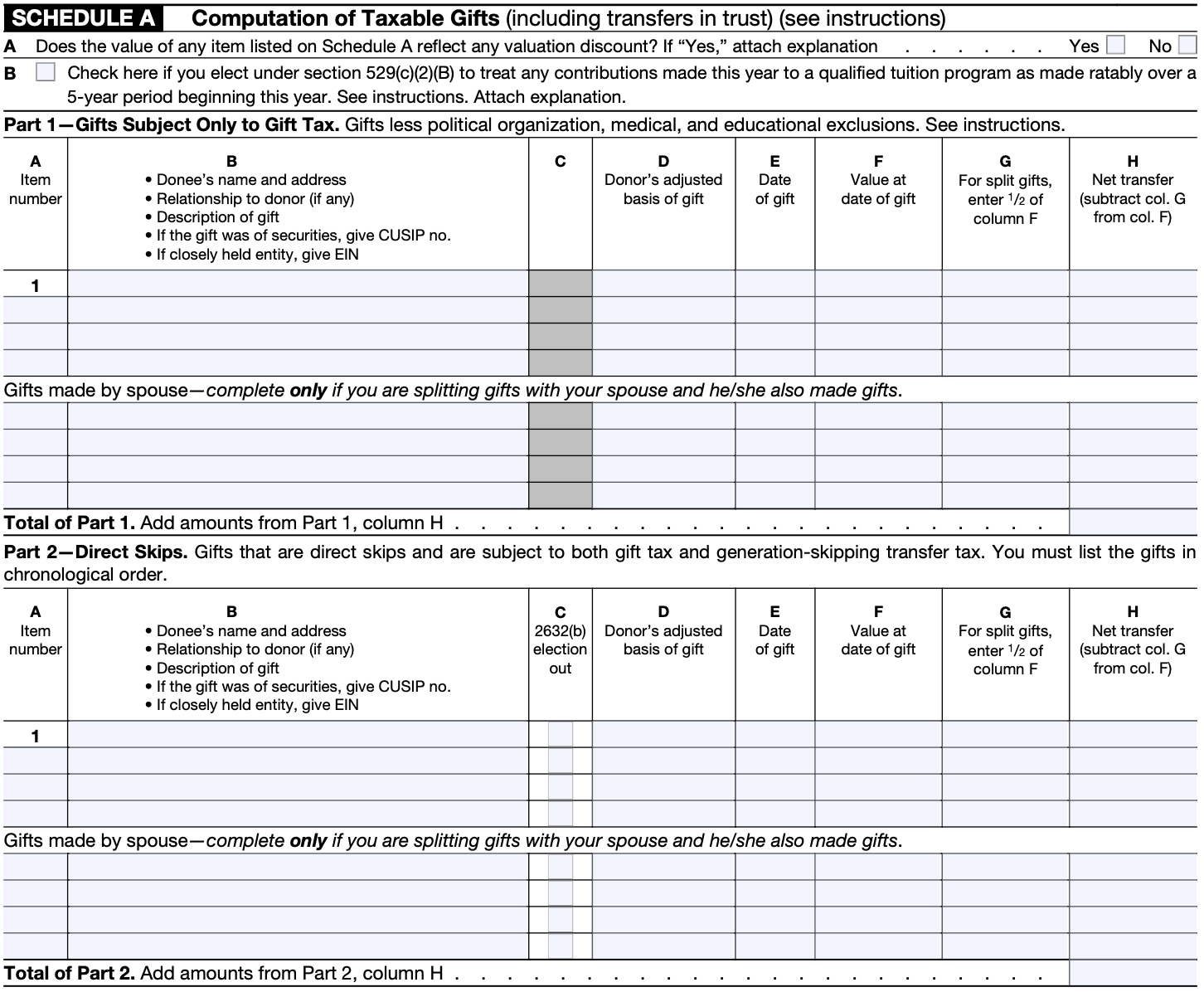 In this section, you'll report the gifts made during the tax year that exceed the annual exclusion amount. Calculate the total taxable gifts and enter them accordingly.