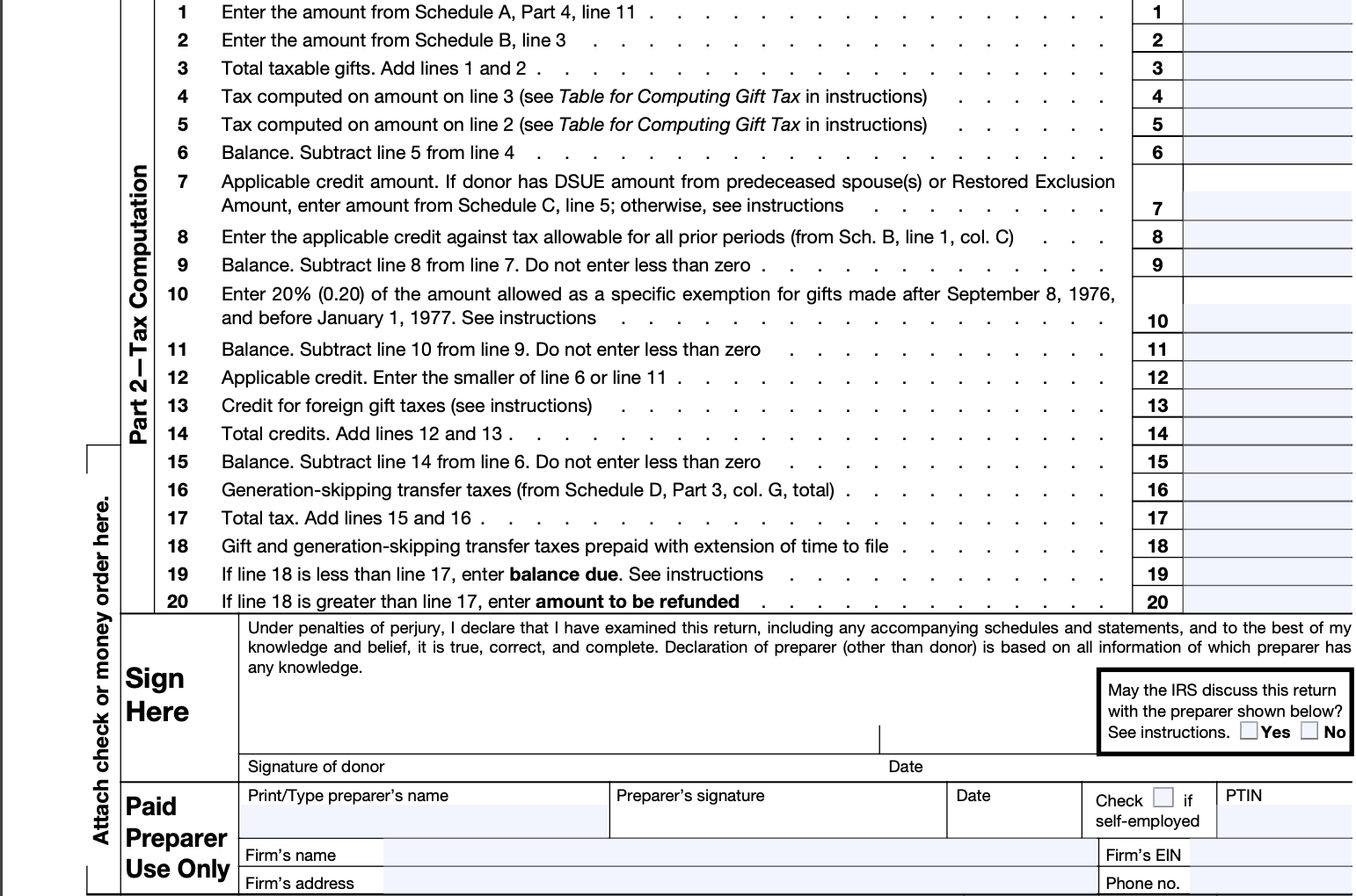 Use the appropriate tax rate table or the unified credit to calculate the gift tax owed. The unified credit exempts a certain amount of taxable gifts from tax liability. Consult the instructions to ensure you're using the correct rates and credits for the tax year in question.