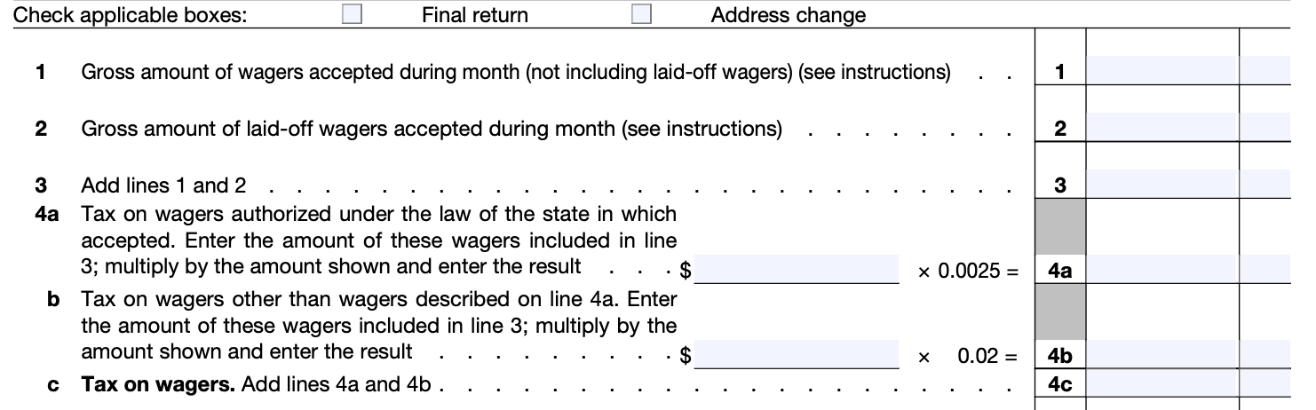 Calculate the tax liability: The federal excise tax rate for wagers may vary depending on the type of wagering activity. Make sure to calculate the tax liability correctly based on the applicable rate.