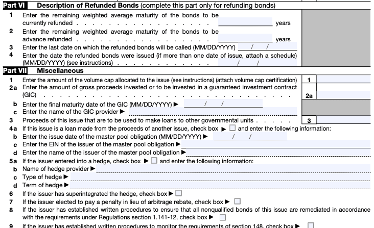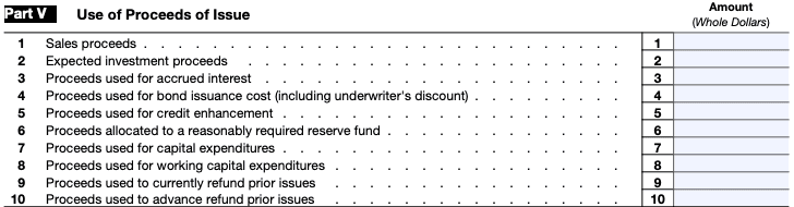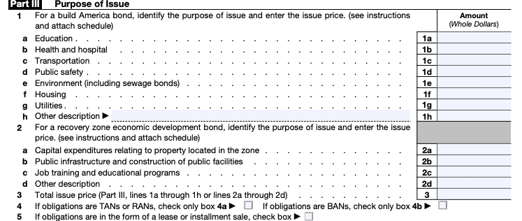 Part I gathers information about the issuer and the bond issue. This includes the purpose of the bond issue, the type of bonds being issued, and whether it's a new issue or a refunding.