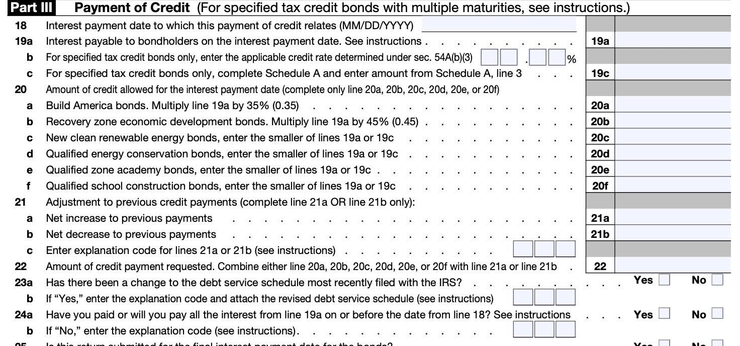 At the top of the form, you will find fields where you need to enter basic information, including the name and address of the issuer, employer identification number (EIN), the type of bond, and the credit payment amount being claimed.