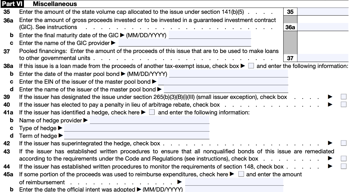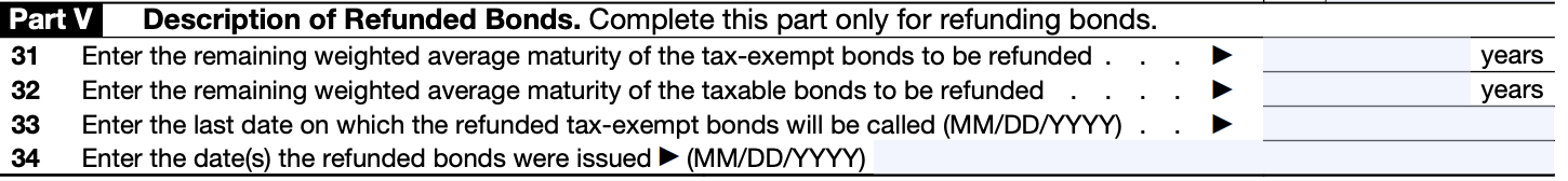 Part V requires information about arbitrage, rebate, yield reduction payments, and other related matters. Be prepared to provide specific financial data regarding investment earnings on the bond proceeds.