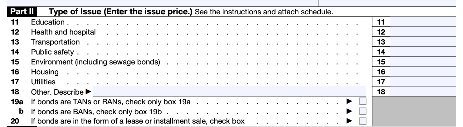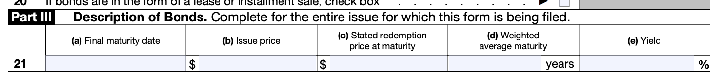 In Part III, you will need to specify if the bond is a private activity bond, and if so, provide details about the facility used, location, and ownership.