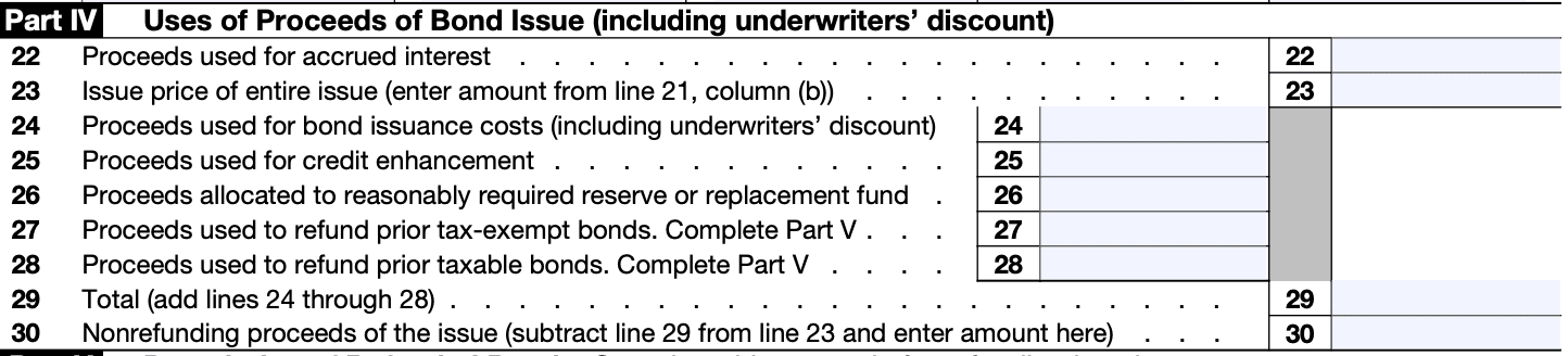 Part IV is dedicated to providing information about the private business use of the bond proceeds. This section is essential for determining compliance with tax exempt status requirements.