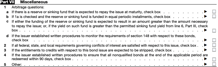 Part III is used to report any private business use of the bond proceeds or the property financed by the bond issue. This section is crucial for compliance with tax regulations related to tax credit bonds.