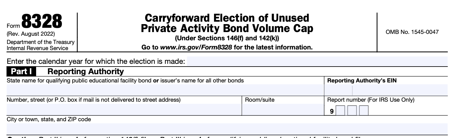 Carryforward of unused volume cap: Private activity bonds are subject to volume cap limitations set by the federal government. If a state or local government entity has an unused portion of its allocated volume cap for private activity bonds, they can carry forward that unused volume cap to future years. Form 8328 is used to make this carryforward election.