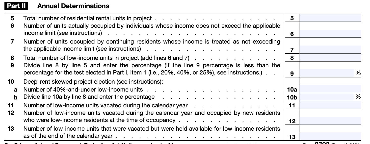 Deadline: Form 8703 must be filed annually by the owner of the low-income housing property. The deadline for filing the form is 12 months from the last day of the month in which the building was placed in service.