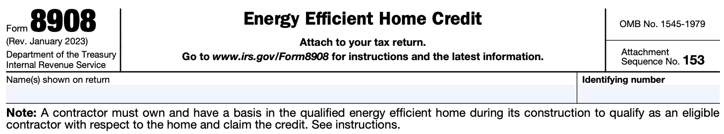 Eligible contractor: The taxpayer filing Form 8908 must be an eligible contractor. An eligible contractor is defined as a person who constructed, manufactured, or produced a qualified energy-efficient home.
