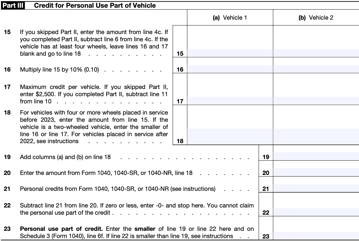 Vehicle use: The credit is generally available only for vehicles used primarily for personal use, not for business purposes. There might be exceptions for certain business use, but it's essential to understand the rules.