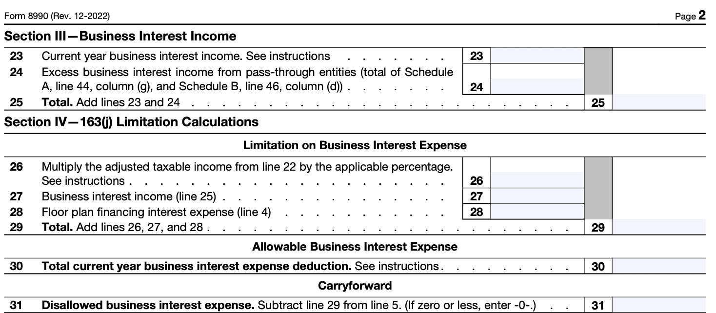 On Form 8990, you'll calculate your interest expense limitation as 30% of your adjusted taxable income, adding any business interest income and floor plan financing interest, and then subtracting your business interest expense.