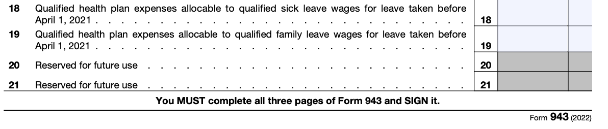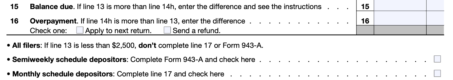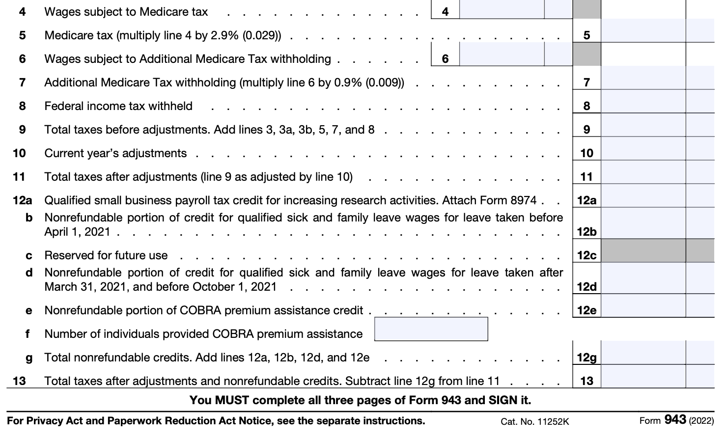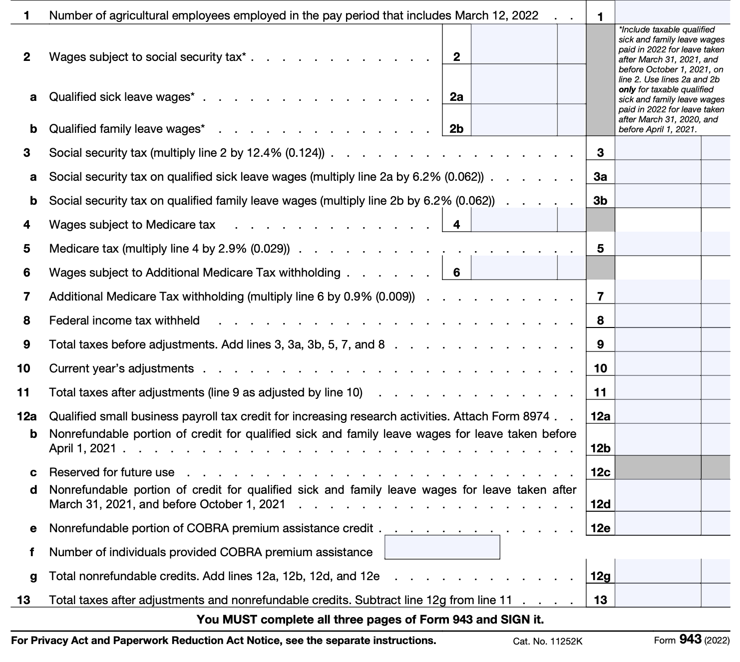 Line 12: If your business qualifies for a tax credit, enter the amount and fill out Form 8974 and attach it to the completed Form 943.