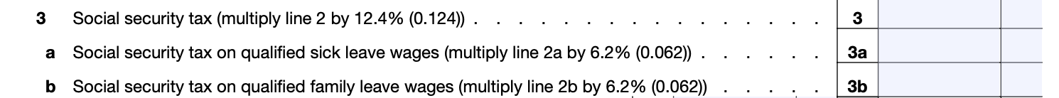 Line 3: Calculate Social Security Tax due by multiplying the total on line 2 x 12.4%.