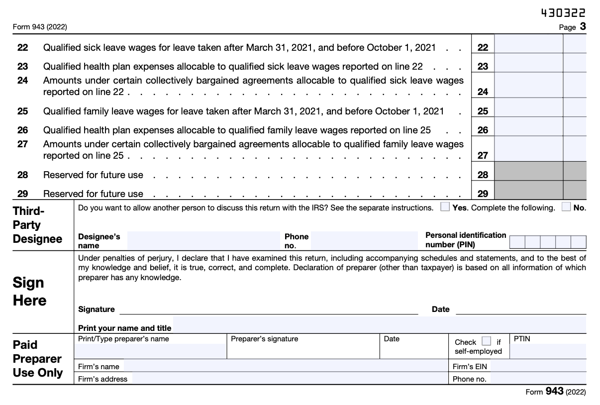 If using payroll software or services, the information needed should be easily accessible from your payroll journal. For additional more detailed instructions for Form 943, please visit IRS.gov.