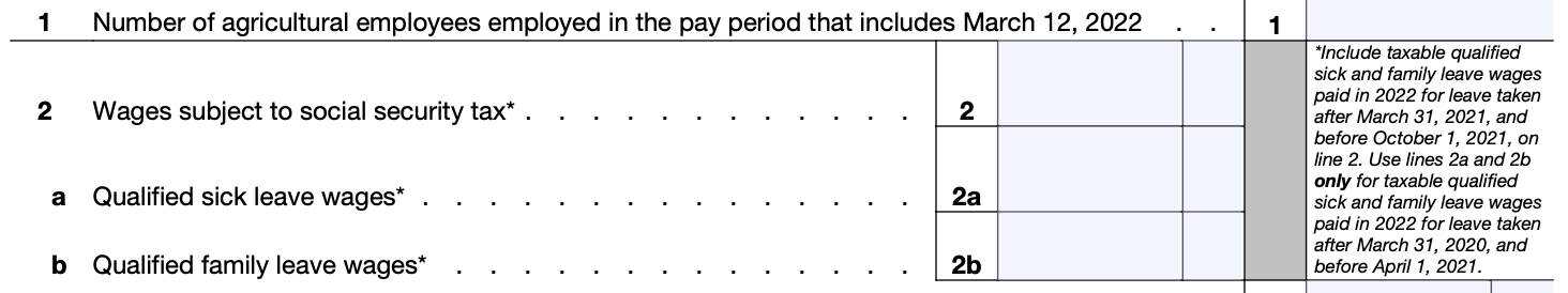 Line 1: Enter the total number of agricultural employees paid during the pay period that includes March 12, 2022.