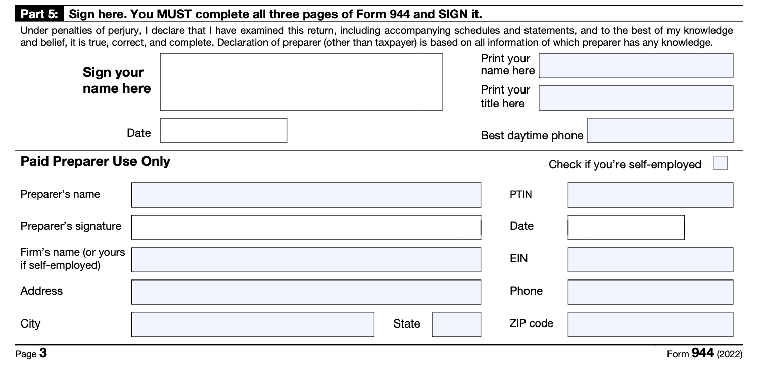 Once you have completed Form 944, you will need to submit it to the IRS along with any required payments. You can file the form electronically or by mail. If you choose to file electronically, you can use the IRS e-file system or a third-party provider. If you file by mail, be sure to include any payments due with the form.