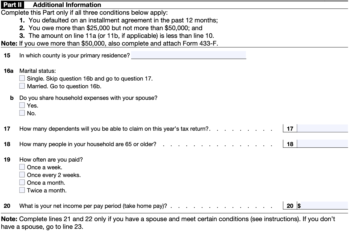 Fill out the financial information section, which includes details about your monthly income, living expenses, and assets. This information helps the IRS assess your ability to pay and determine the appropriate monthly installment amount.