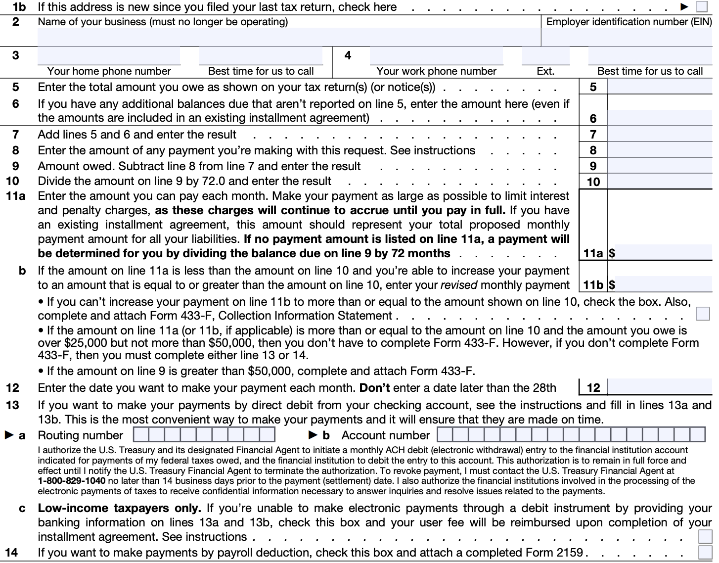 b. Fill out the form manually, providing accurate and complete information. Make sure to include your personal details, tax information, and proposed installment agreement terms.
