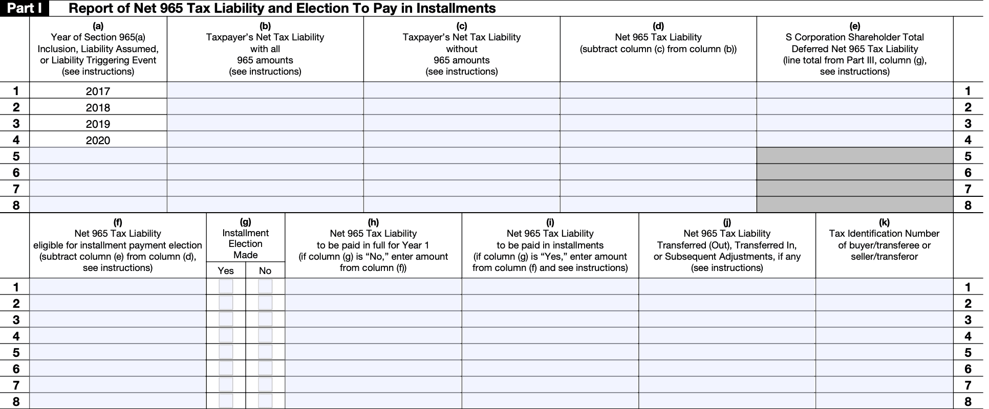 Form 965-A is an individual tax form used to report the net tax liability under Section 965 of the Internal Revenue Code (IRC). This section was introduced as part of the TCJA to address the deemed repatriation of deferred foreign income for certain specified foreign corporations. Essentially, it is a one-time tax imposed on accumulated earnings and profits held overseas by U.S. shareholders.