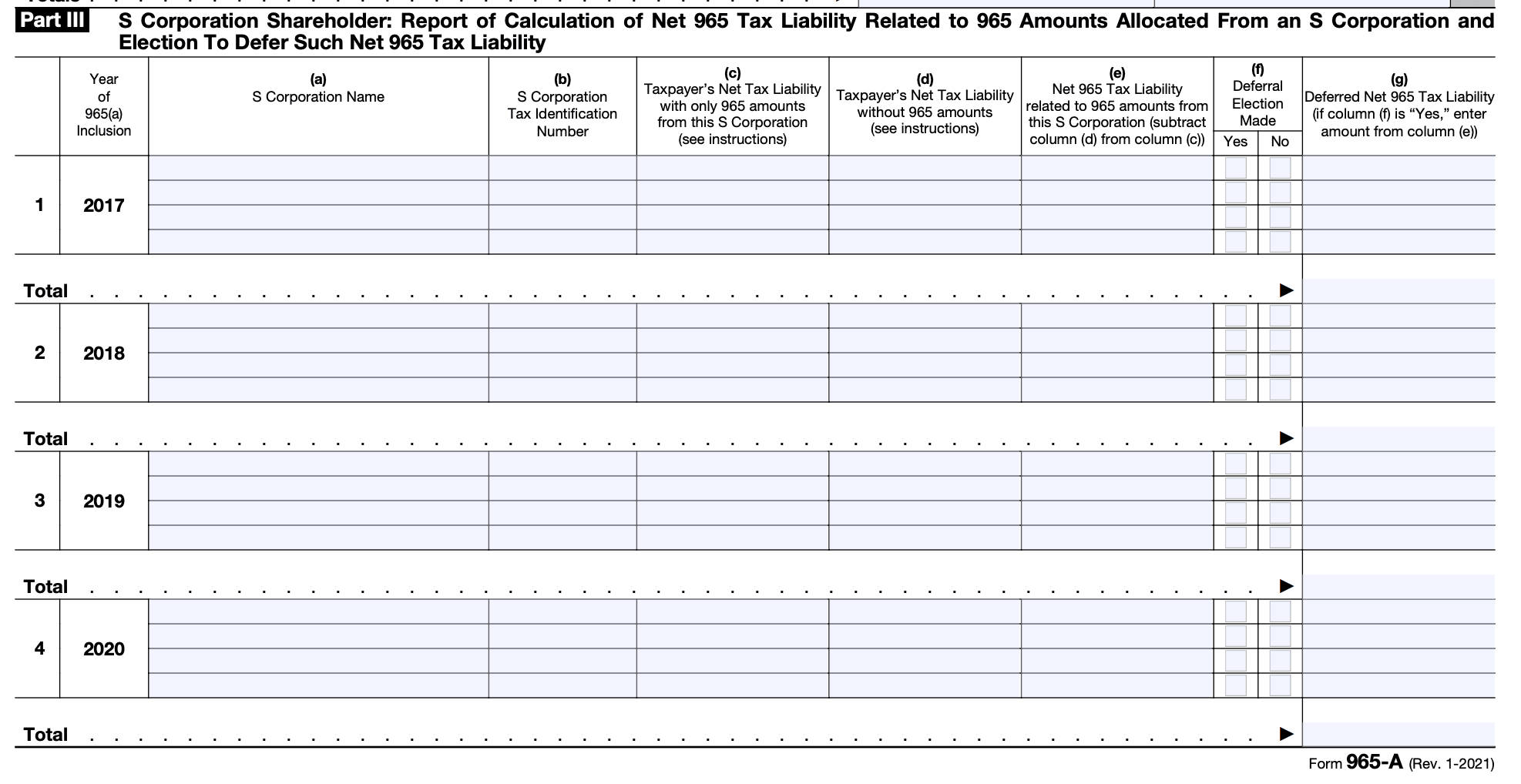 Reporting foreign earnings: Form 965-A requires detailed reporting of the accumulated post-1986 deferred foreign income of specified foreign corporations. The form provides specific lines for reporting these amounts.