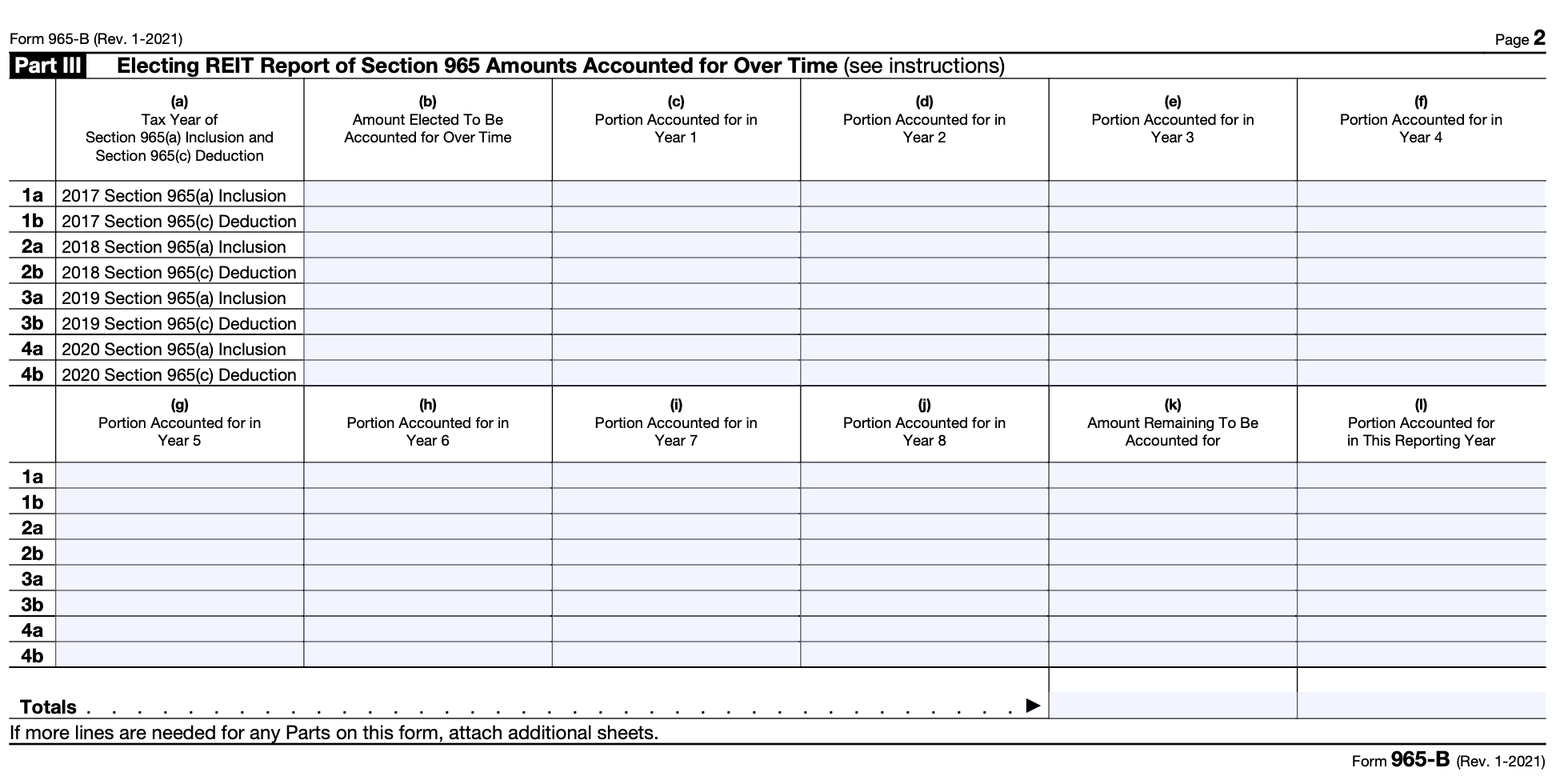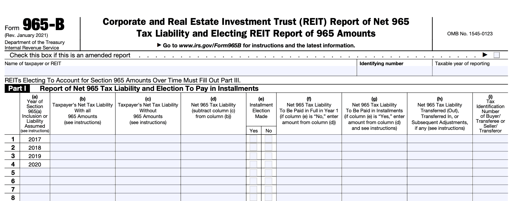 Additionally, the form also serves as the Electing REIT Report of 965 Amounts. REITs have the option to make an election under Section 965 to pay the transition tax over an eight-year period instead of a one-time payment. Form 965-B is used to report the amounts elected by the REIT for inclusion in their taxable income and the corresponding tax liability for each year of the eight-year period.