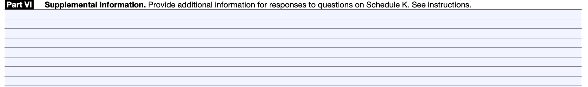 Part VI of Schedule K requires any other supplemental information related to tax exempt bonds that the IRS needs to know.