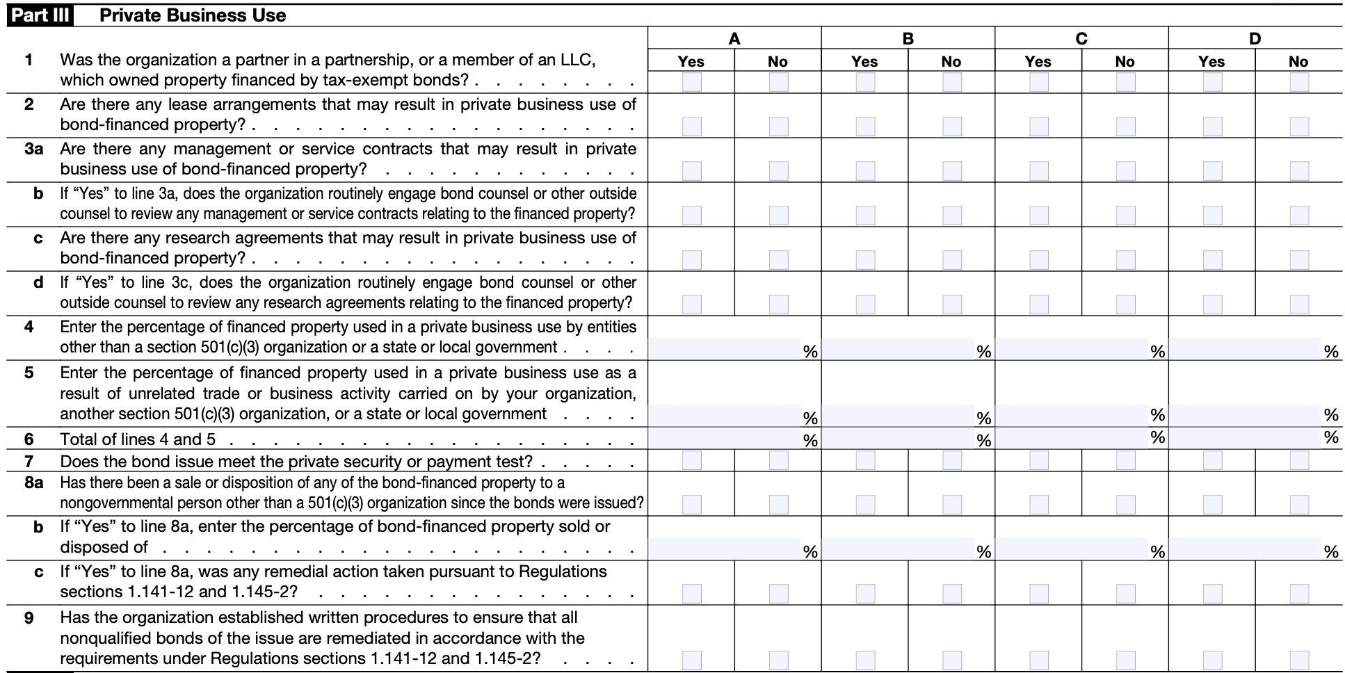 If your organization issued tax exempt bonds and used the bond-financed property for any private business use, you must complete Part II of Schedule K. Private business use refers to the use of the tax exempt bond-financed property by parties outside the tax exempt organization, such as for-profit companies.