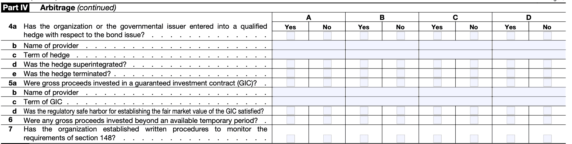 If your organization invested the bond proceeds and earned interest or other investment income, you'll need to report this information in Part III of Schedule K. The IRS imposes restrictions on arbitrage, which is the practice of earning a profit from the difference between the interest rate on the tax exempt bonds and the rate earned on the invested bond proceeds.