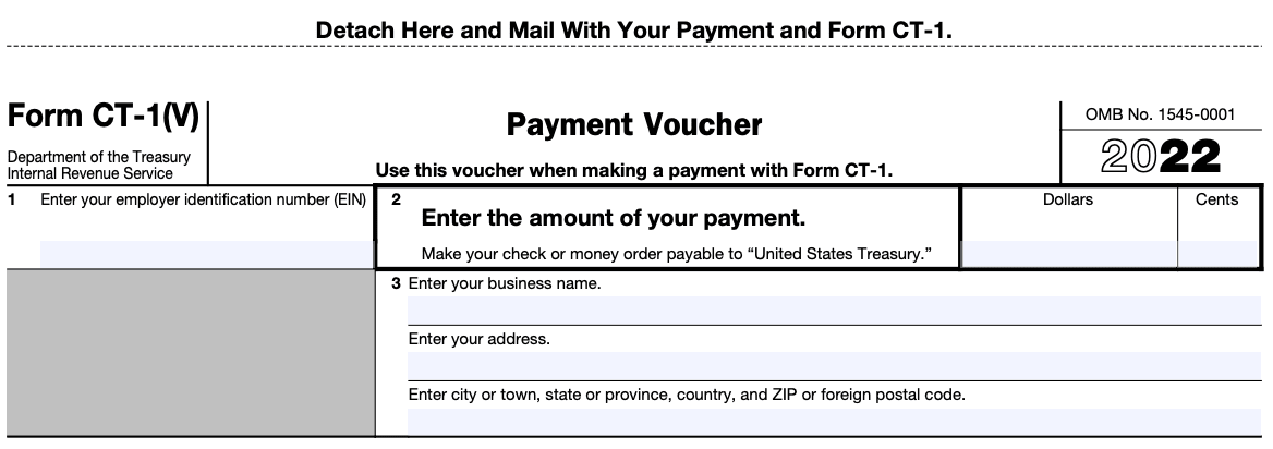 Payment of taxes: Along with filing Form CT-1, you must remit the taxes due. The IRS provides various payment options, including electronic funds transfer (EFT), credit/debit card payments, or mailing a check or money order.