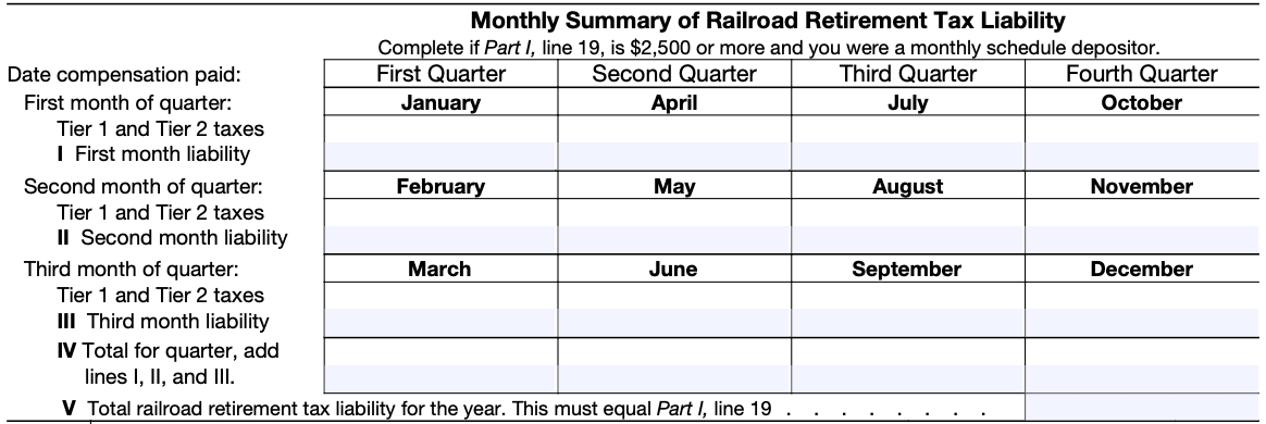 In Part II, you'll report the total compensation paid to railroad employees during the tax year. This includes wages, salaries, tips, bonuses, commissions, and other forms of compensation subject to the Railroad Retirement Tax Act (RRTA).