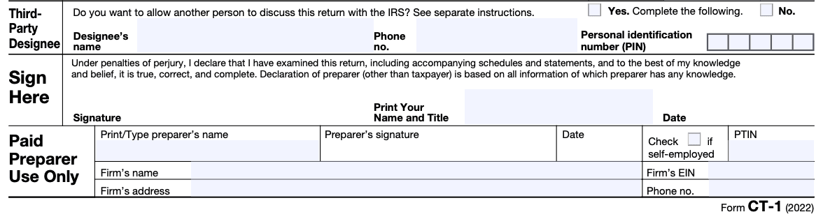Remember, this step-by-step guide is a general overview, and it's important to refer to the specific instructions for Form CT-1 provided by the IRS. If you have any doubts or need further assistance, consider consulting a tax professional or reaching out to the IRS directly for clarification.