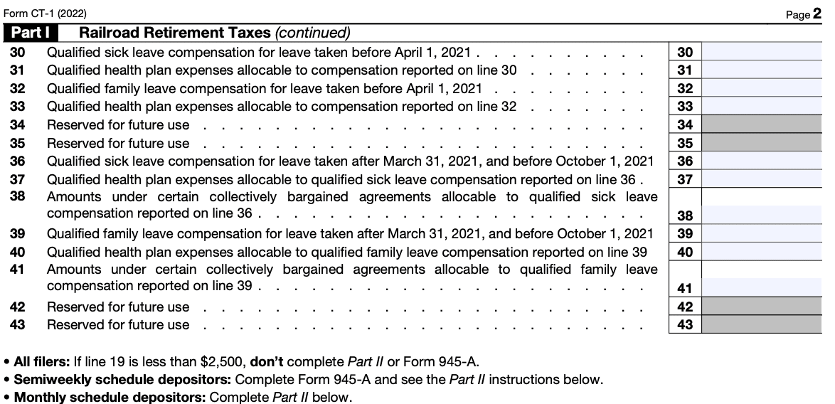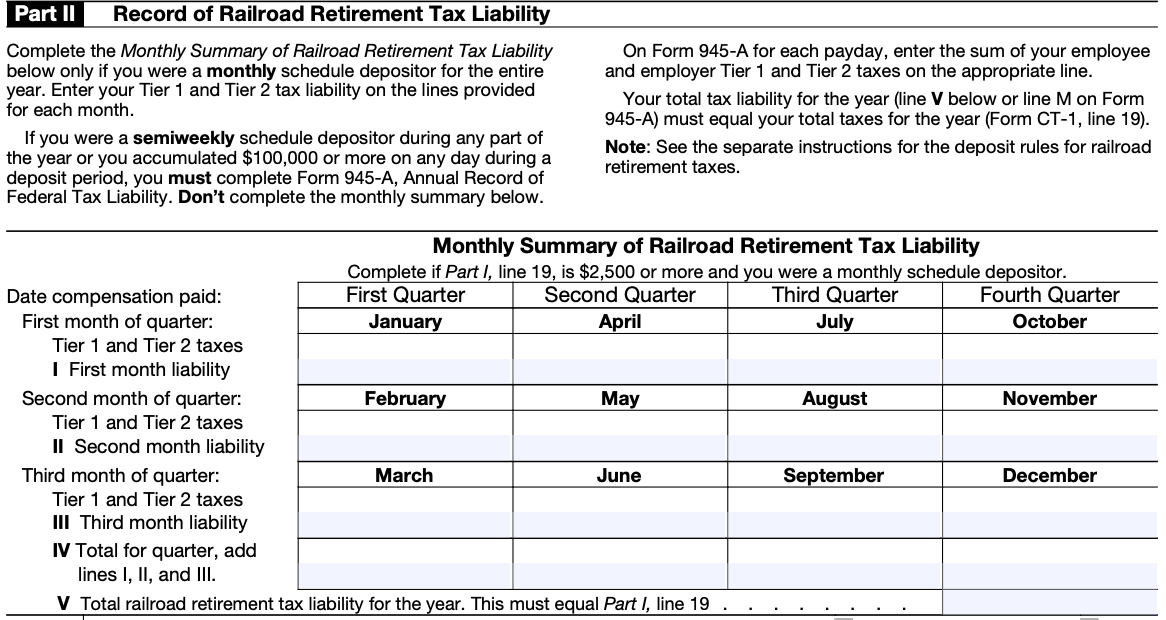 Separate tax rates: The Railroad Retirement Tax has its own tax rates and wage bases that are different from the rates for Social Security and Medicare taxes. It's important to refer to the latest instructions for Form CT-1 to determine the correct rates and wage bases for the tax year you are filing.