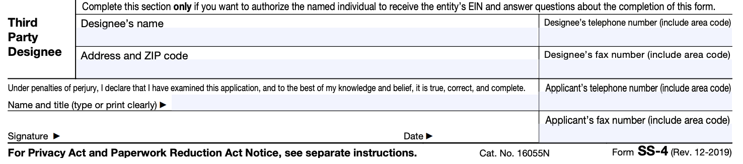 - The form must be signed by the responsible party or fiduciary, depending on the type of entity applying for an EIN.