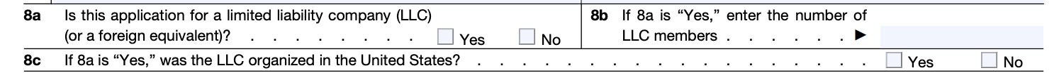 - Line 8a: Check the box to confirm if the entity is an LLC.