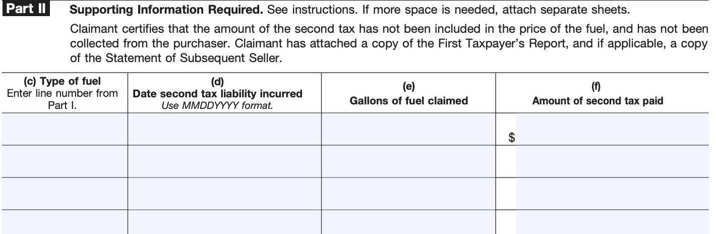 In Part II, you will need to provide details about the fuel for which you are making the claim. This includes the type of fuel, number of gallons, and the claim amount. Ensure that you accurately report the fuel type and quantities.